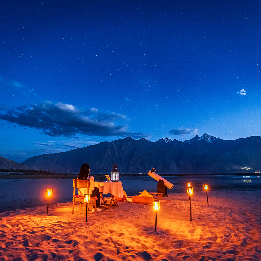 Experience spectacular stargazing opportunities, mouthwatering BBQ feast and guided astronomy session at Sumur Sand dunes. Lchang Nang Retreat promises an unforgettable evening of celestial wonder and culinary indulgence amidst the serene Sumur dunes located in Nubra Valley. With minimal light pollution and clear skies, this natural amphitheatre provides an ideal setting for stargazing enthusiasts to marvel at the wonders of the cosmos.